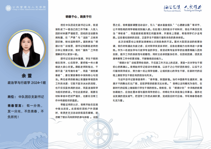 在开营仪式上,邵丽娜书记阐释“明德”内涵,提出三点希望:立鸿鹄志,做理想信念坚守者;练真本领,做知行合一实干家;怀赤子心,做服务同学贴心人。船舶与海洋工程学院薛航老师作《守初心 担使命 善作为——解锁优秀学生干部的成长密码》专题讲座,薛航老师结合一线案例,从初心使命、责任担当、方式方法三个维度强调学生干部要守住服务初心、敢于担当、讲究方法,在成就他人中实现自我成长。