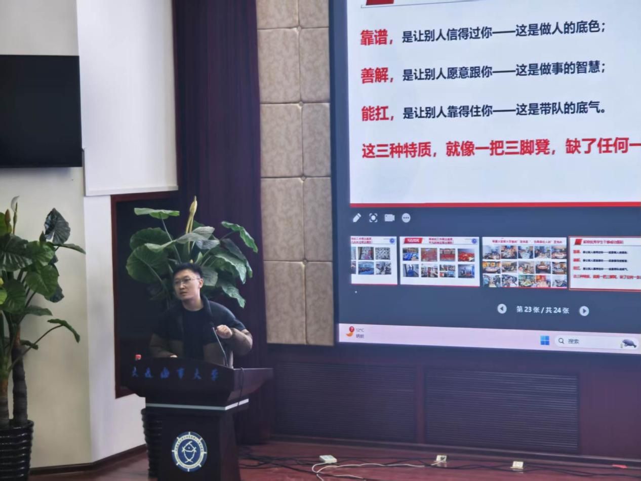 船舶与海洋工程学院指导员薛航,以 《守初心 担使命 善作为——解锁优秀学生干部的成长密码》为主题作讲座。他结合工作经验,从 “初心使命”“责任担当”“方式方法” 三个维度切入,用大量生动的案例,为同学们解锁了如何成为一名优秀学生干部的“通关密码”:学生干部不仅是一种身份,更是一种责任,要时刻守住为同学服务的初心,在关键时刻站得出来、顶得上去,更要善于思考、讲究方法,在成就他人的同时实现自我价值的提升。